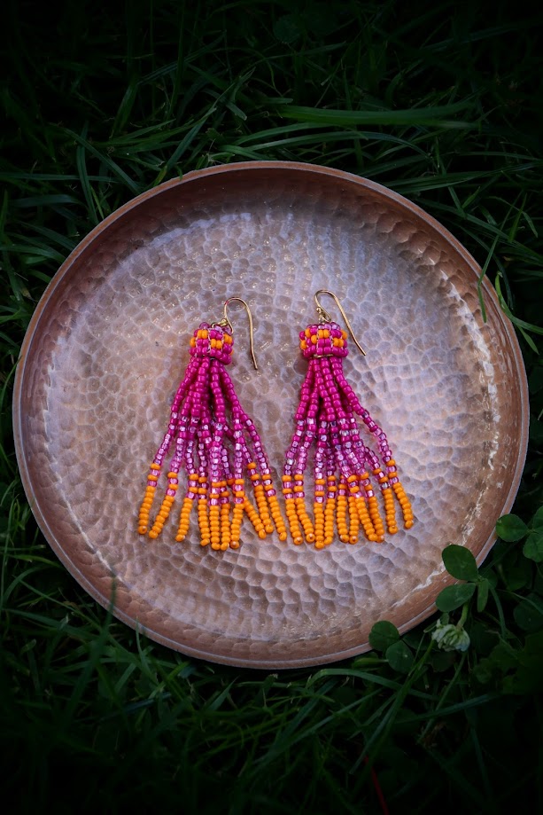 Øreringene er håndsyet med perler i farverne: