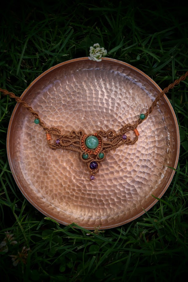 Halskæden er skabt ved brug af mikro macrame knytte metoden, og den kan bruges både som armbånd, ankelkæde eller et “diadem” på det tredje øje.