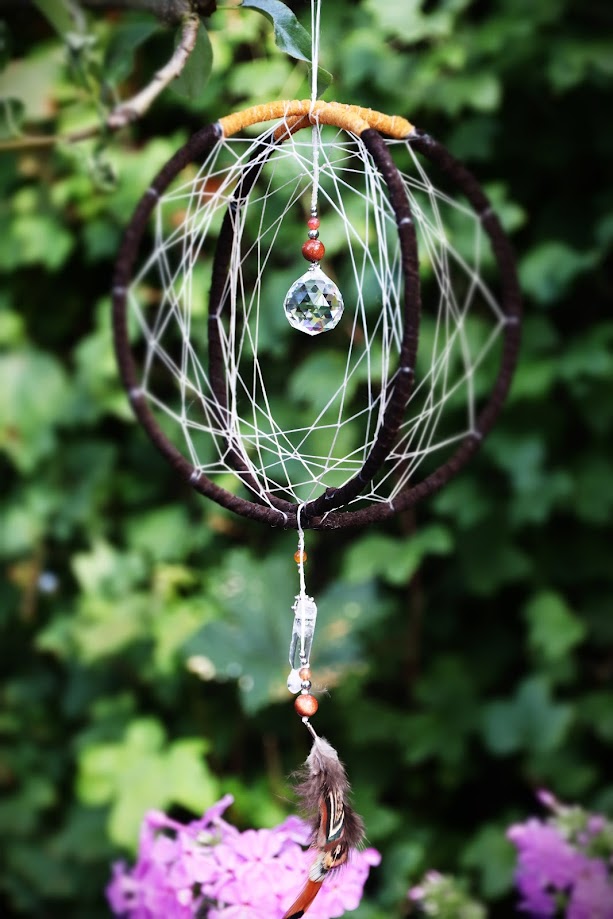stenene den er lavet med er solsten, bjergkrystal, rød agater og en smuk glas prisme som spejler solens stråler så smukt og støtter dig i at lade dit indre lys skinne.