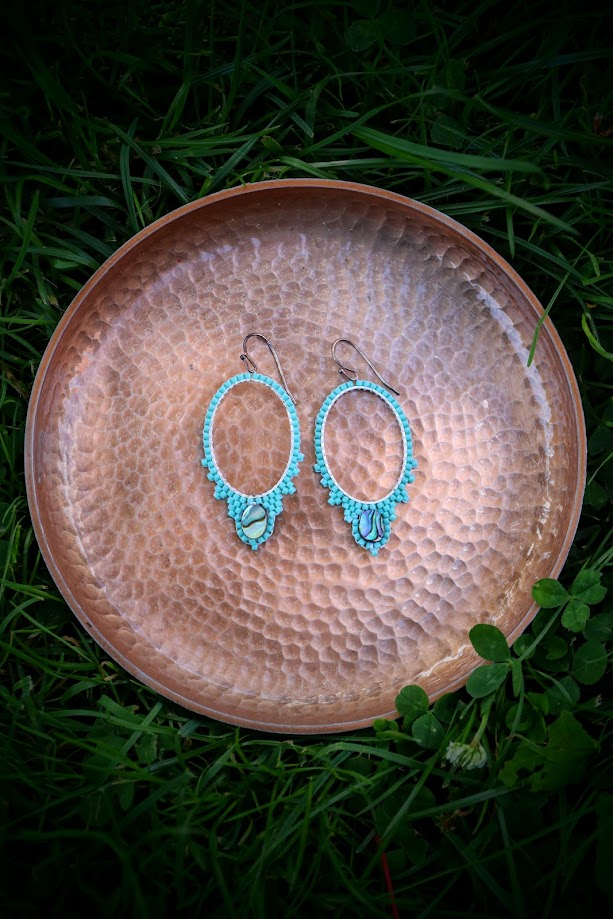 Øreringene er håndsyet med muyaki perler i en frisk turkis farve med en smuk changerende abelone perle.